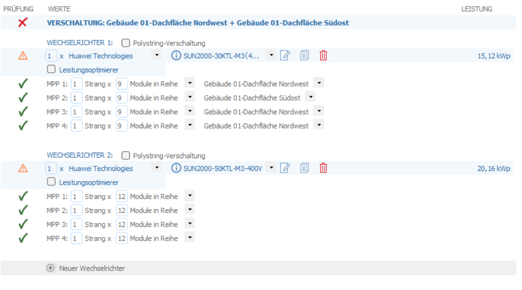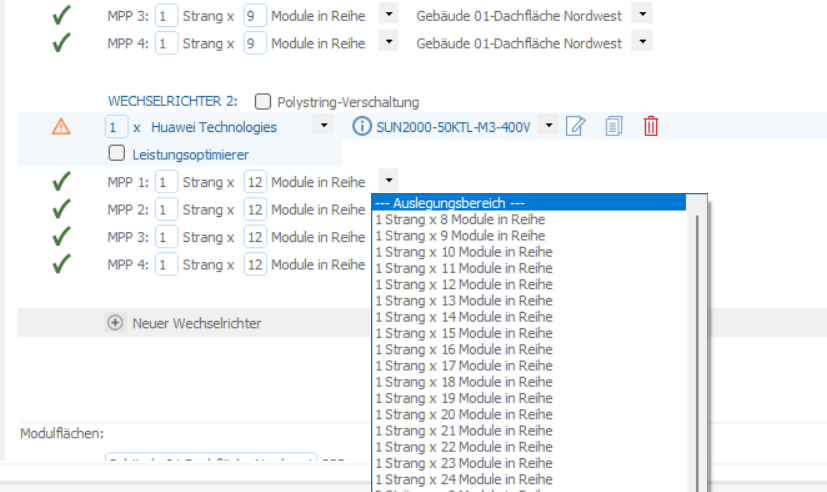 Hallo zusammen, seit dem neuen Update von gestern kann ich nicht wie gewohnt, bei der Verschaltung, weitere Wechselrichter einfügen und dort die Modulflächen auswählen. In den zwei Screenshots ist es hoffentlich deutlich zu sehen. Liegt das an dem Update oder habe ich da ein anderes Problem? wie kann ich das lösen? Vielen Dank im Voraus und beste Grüße Zina