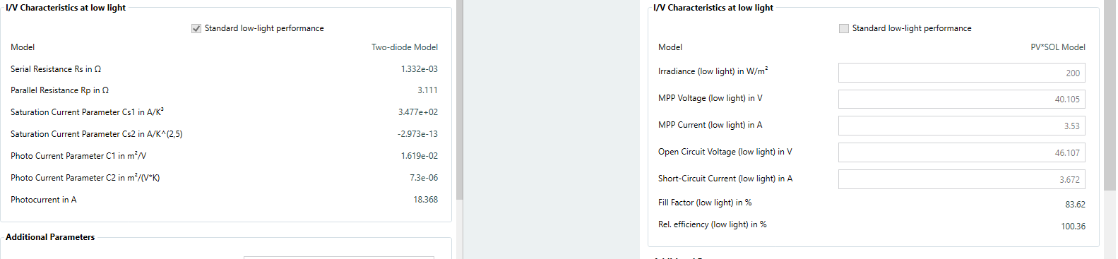Hi Bruno Lalic, the difference comes from the low light parameters: left: "TSM-705NEG21C.20 Vertex N Bifacial 705 W" right: "TSM-705-NEG21C.20 VERTEX N 2024 705 W" In one case, the manufacturer has chosen the "standard low-light performance", which defaults to the two-diode-model for this module. In the other case, the manufacturer entered low light values himself, that is, defined values for voltage and current at 200 W/m². Hope that helps, kind regards, Martin