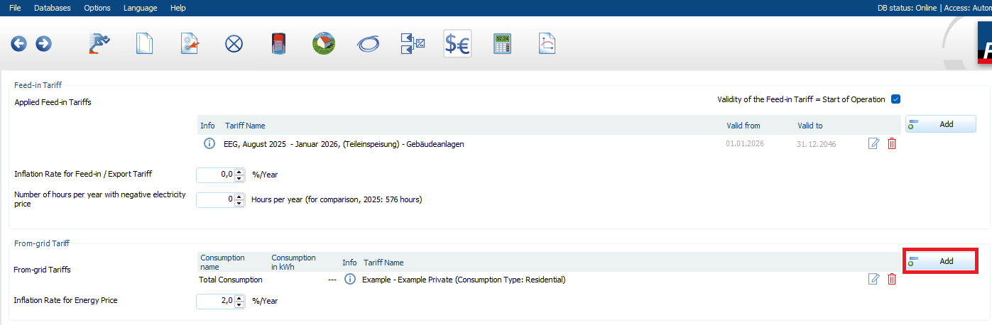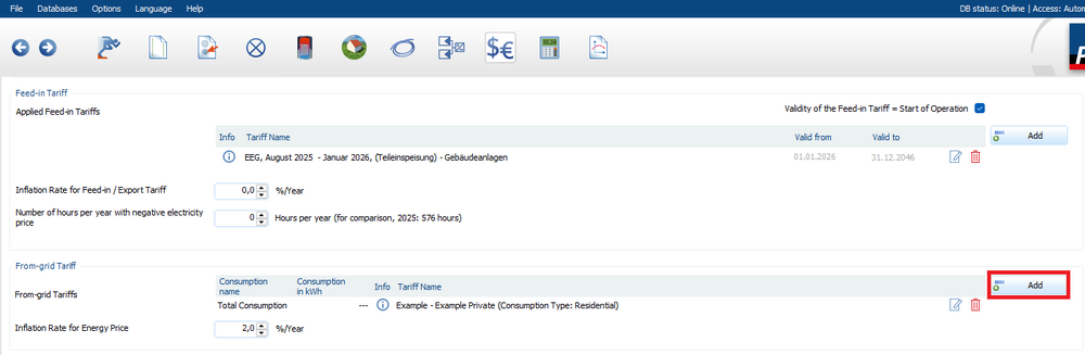 In PV*SOL premium and PV*SOL, please open the tariff database via "Databases" --> "Feed-in Tariffs" or "From-grid Tariffs" and select the "New" icon. Then enter the required data. -