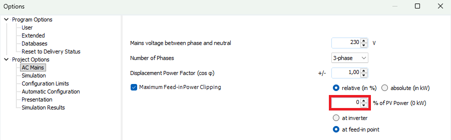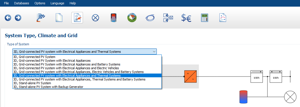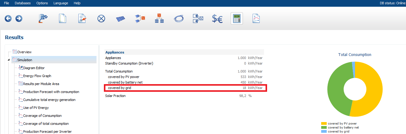 On the "System Type, Climate and Grid" page, you can select the "Stand-alone PV System" (with and without a backup generator) system type. Planning stand-alone systems in PV*SOL is based on the SMA Off-Grid Configurator program, which we originally developed for SMA. This program contains the design rules that SMA has specified for us. These rules cannot be changed or deactivated. For example, only systems with AC-coupled battery systems can be planned; DC systems are unfortunately not possible. We understand that these rules may not necessarily apply to other manufacturers and may entail further limitations. For greater flexibility in component selection and improved transparency during the planning process, we recommend that you initially plan your stand-alone system as if it were a grid-connected system: On the "System Type, Climate and Grid" page, select a grid-connected system. Set the feed-in limit to zero; then no energy will be fed into the grid: The value under "Total consumption covered by grid" indicates the energy that cannot be covered by the PV system. This energy must be provided by the backup generator or (if you are not planning on a backup generator) "approach zero".