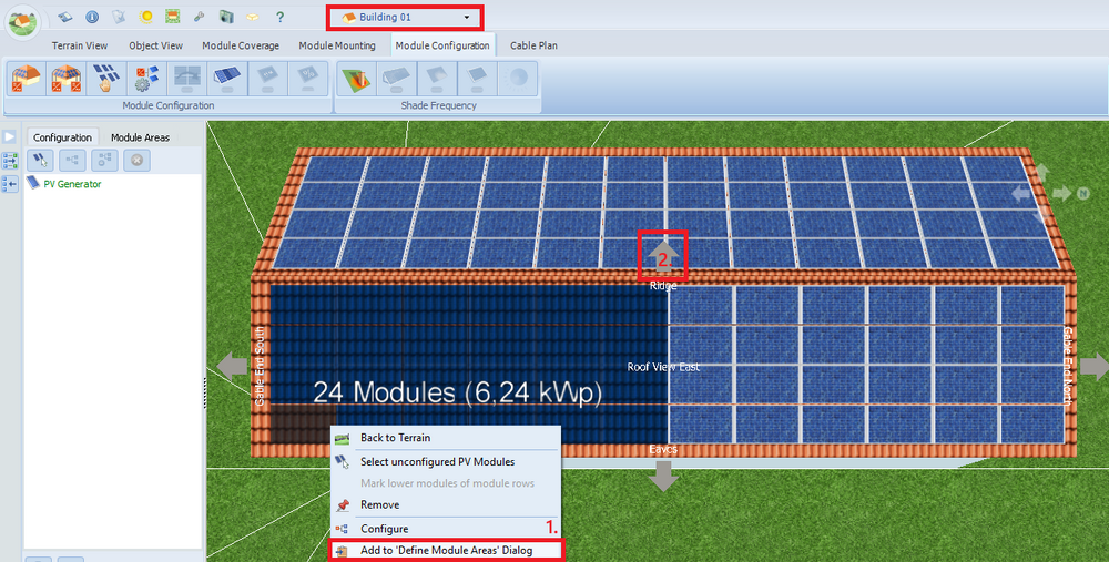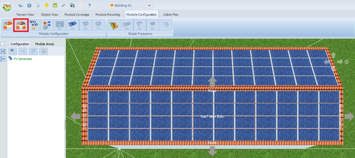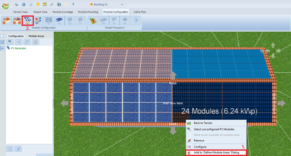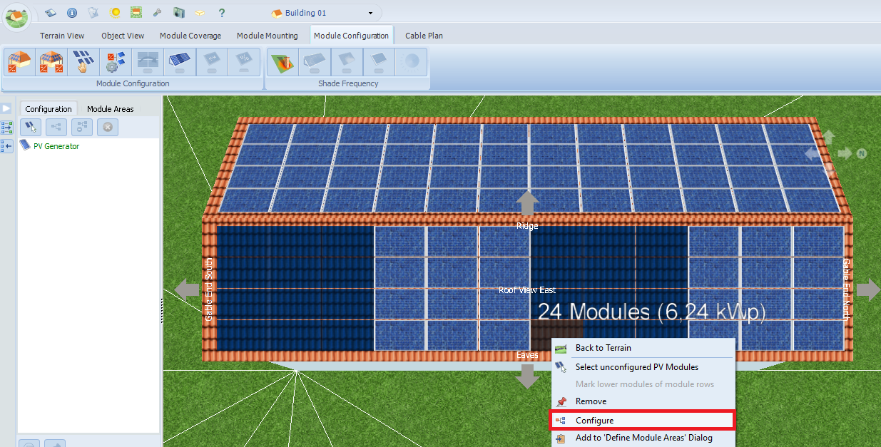 Scenario 1: You can connect all modules on two or more roof areas together using the "Configure all unconfigured modules" button: Scenario 2: To configure several—but not all—modules from the same roof area to a single inverter, first select them by holding down the Ctrl key and left-clicking. Then, right-click and select "Configure": Scenario 3: You can also configure multiple module areas on different roof areas together. First, define which modules should be configured together. Select the desired modules from the first module area, right-click on the selected modules, and choose "Add to 'Define Module Areas' Dialog." Use the gray arrow to switch to the other side of the same roof. (Or you can use the dropdown menu in the top menu bar to switch to a different building.) Now select the desired modules of the second module area, right-click on the selected modules, and choose "Add to 'Define Module Areas' dialog." Then click the "Define Module Areas for Configuration" button: You can rename the module areas if necessary (right-click → Rename). Then click "Configure": In the inverter configuration window, select both module areas and click "Configure module areas together." You can then select the desired inverter:-