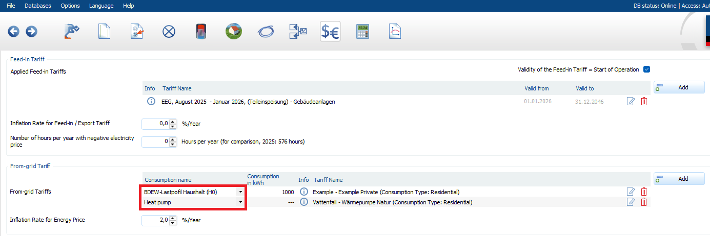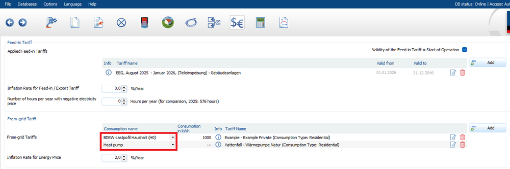 On the "System Type, Climate, and Grid" page, select a system type with a thermal system: After entering information for both consumers (household consumption and heat pump), you can add a second tariff on the "Financial Analysis" page: Now you can assign the corresponding consumer (household consumption or heat pump) to each tariff: