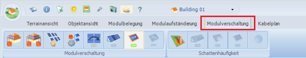 Hallo, vielen Dank für Ihre Anfrage. In der 2D-Planung finden Sie das Symbol für die Wechselrichter-Verschaltung in der Hauptmenü-Leiste: In der 3D-Planung wechseln Sie erst in die 3D-Umgebung: Dort finden Sie den Reiter "Modulverschaltung": Die Testversion hat denselben Funktionsumfang wie die Vollversion, mit der einzigen Einschränkung, dass keine Projektberichte heruntergeladen werden können.