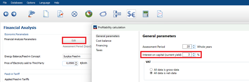 The feed-in tariff shown in the table or graph changes every year, even if you haven't entered any degradation, because it displays the net present value, not the amount of the feed-in tariff. This means that each year's feed-in tariff is discounted back to its initial value using the interest on capital (current yield). If you want to see the feed-in tariff amount over time without interest, set the capital interest to zero.
