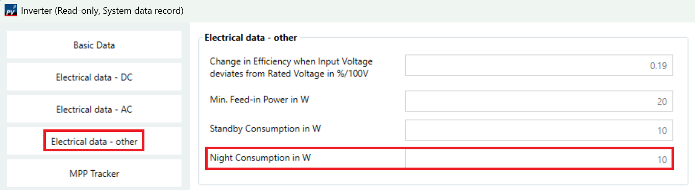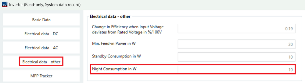Dear Michael, Thank you for your inquiry. Unfortunately, nighttime consumption can only be entered for PV inverters, not for battery systems. We will forward this request to our development team. You cannot include an inverter without connected strings. A nighttime consumption of 10 W is currently configured for the Fronius Symo GEN24 10.0. If you know the nighttime consumption of your battery system, you can copy the data set for the Fronius Symo GEN24 10.0 (right-click --> Copy) and save it again. You can then make changes in the newly created data set and enter a higher nighttime consumption value.