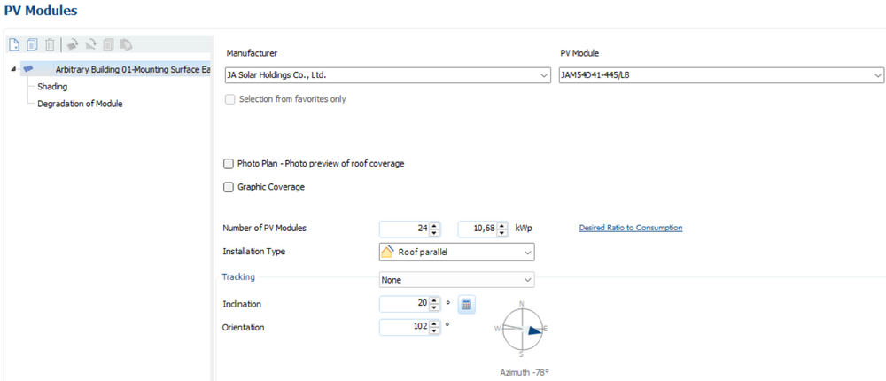 Dear Anders, Thank you for your inquiry and for sharing the project file. Unfortunately, it's not possible to determine the number of PV modules based on a predefined self-consumption rate. We recommend switching from 3D planning to 2D planning. There, you can quickly simulate different system sizes by entering the new number of modules and test whether the desired self-consumption rate is achieved. In your case, a self-consumption rate of 80 percent is achieved with 24 PV modules. (Please ensure you have selected the appropriate battery system. The S6-EH3P10K-LV-ND-H + Pylon-Tech Force H3 (25.6 kWh) battery system is compatible with the S6-EH3P10K-LV-ND-H PV inverter.) Currently, AI control for battery charging and discharging is not included in the calculation. We will forward your suggestion to our development team. Please find enclosed the project file we have edited. partdesign VAL.pvprj
