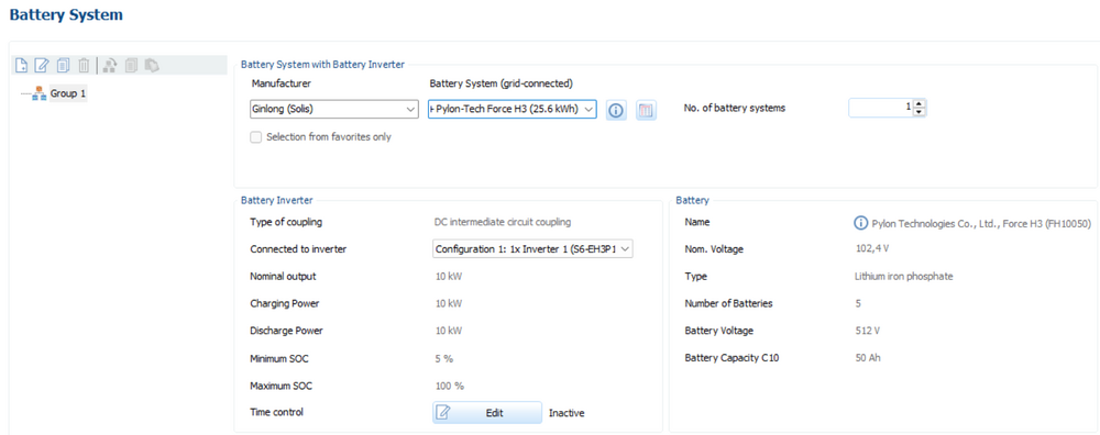 Hi On larger commercial batteries, they have an HVAC system to maintain battery temperature within safe limits. These are usually AC coupled batteries, such that you have a normal string inverter (eg. Fronius Symo 10kW) and a 50kW 215kWh battery, with the battery's 50kW allowing power in and out of the battery to increase self consumption. Not many configurations have PV strings going to the battery Is the consumption of HVAC simulated in PVSol? There could be night time power consumption due to the battery. Where would I put this information in? I know inverters can have night consumption, could i add an inverter with no strings connected for this usecase?