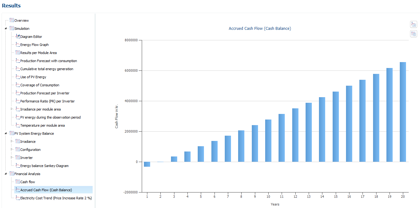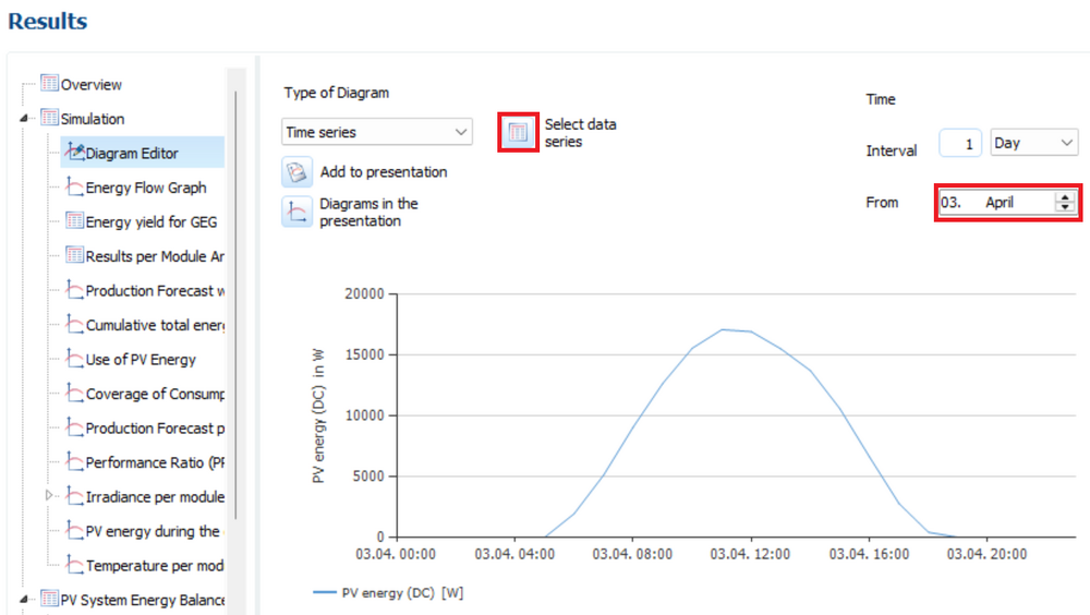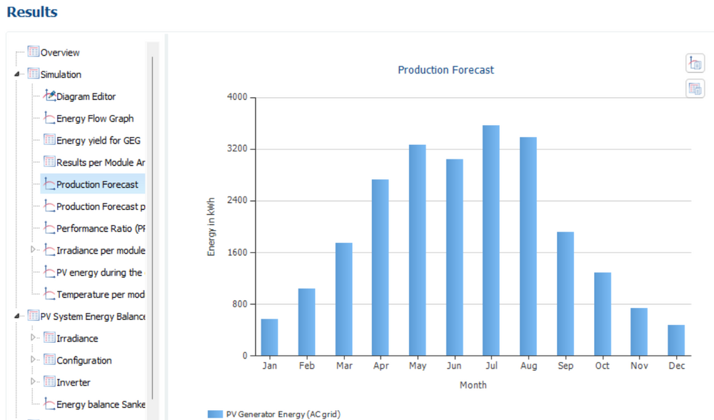 Dear J. Esteban, Thank you for your inquiry. The projected daily generation curve with hourly resolution (for a typical sunny day and a typical cloudy day) can be found in the Diagram Editor after you have performed a simulation with hourly resolution: The projected annual generation curve with monthly resolution can be found under ‘Production Forecast’: