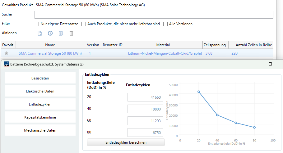 Hallo Christoph Franz-Riegler, vielen Dank für die Zusendung der Projektdatei. Der Hersteller hat den Batteriedatensatz nicht richtig angelegt. 600 Entladezyklen bei einer Entladungstiefe von 80 % sind unrealistisch wenig und der Graph hat einen untypischen Verlauf. Eventuell wurde eine Null vergessen, denn „6000“ wäre ein realistischer Wert, der in der Simulation zu einem sinnvollen Ergebnis führt. Wir werden den Hersteller kontaktieren und um Korrektur bitten. Bis dahin hast du die Möglichkeit, den Batteriedatensatz manuell anzupassen oder einen anderen Batteriespeicher zu verwenden. -