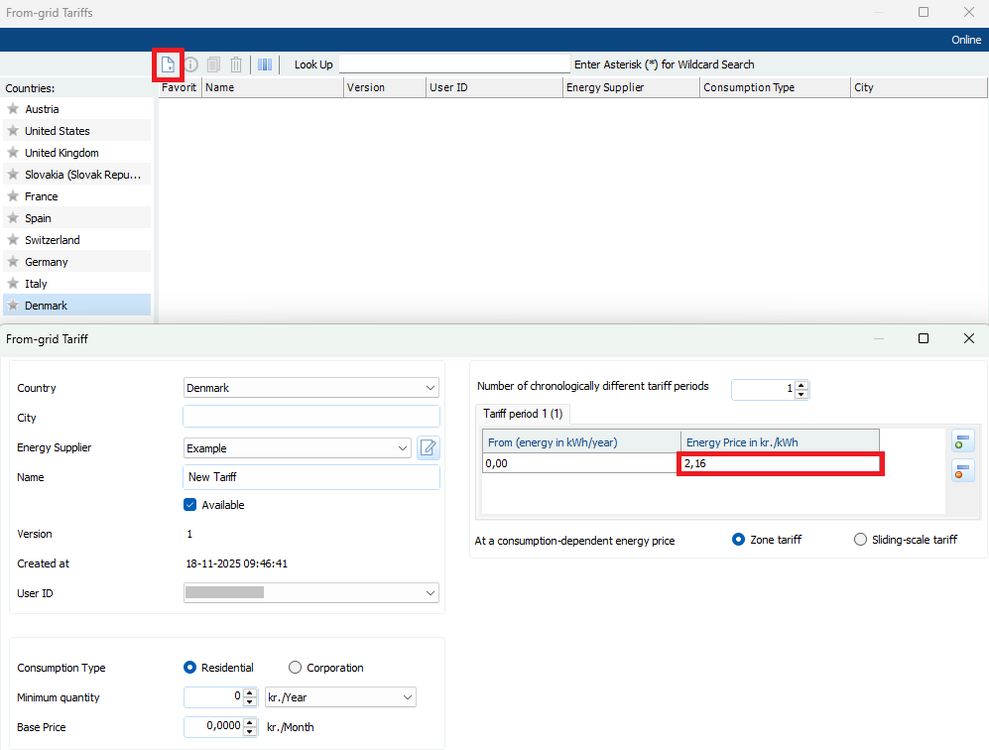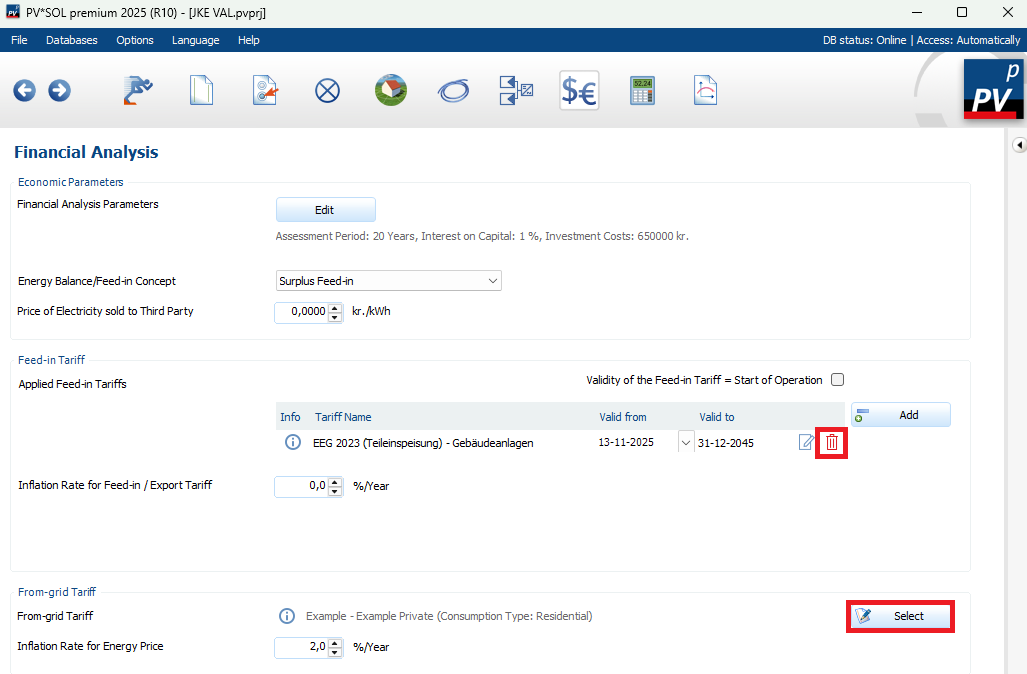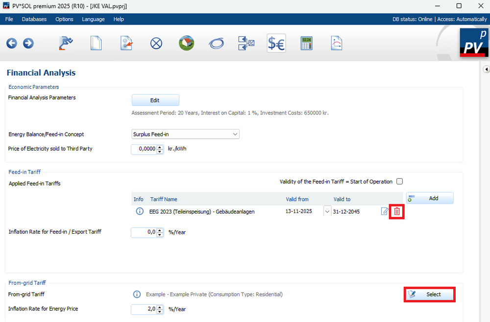 Dear Anders, Thank you for your inquiry. You have entered the investment costs correctly. Since the customer does not receive a feed-in tariff, delete the pre-set feed-in tariff: Then create a new purchase tariff, enter 2.16 DKK per kWh, and start the simulation. The payback period is two years: JKE VAL.pvprj