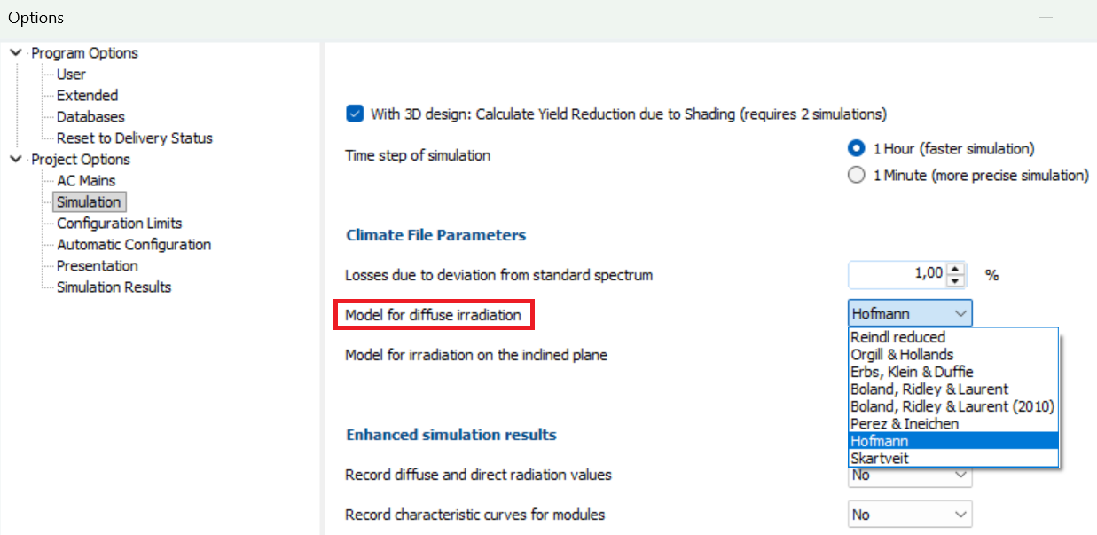Dear Amir, Thank you for your inquiry. Unfortunately, an option to import DHI and DNI is not supported. You can only import these four values: Ta - Ambient temperature in °C Gh - Global horizontal radiation in Wh/m² FF - Wind velocity in m/s RH - Relative humidity in % In PV*SOL, the global radiation on the horizontal GHI is divided into the direct and the diffuse components: BHI (beam horizontal irradiance) and DHI (diffuse horizontal irradiance). The models available for this division are described in our help section. Under "Options" --> "Simulation" you can select which model should be used:
