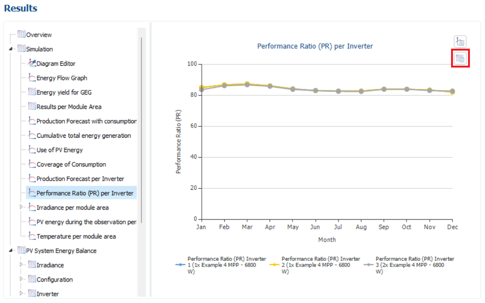 Dear RSK Renewables, Thank you for your inquiry. On the Results page, you will find the performance ratio per inverter. You can copy the monthly values and transfer them to Excel using the button in the upper right corner.