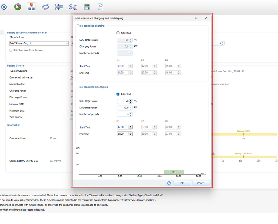 PVsol does offer a minimum discharge level (SOC%), which is very useful. To have enough left over for our own use.