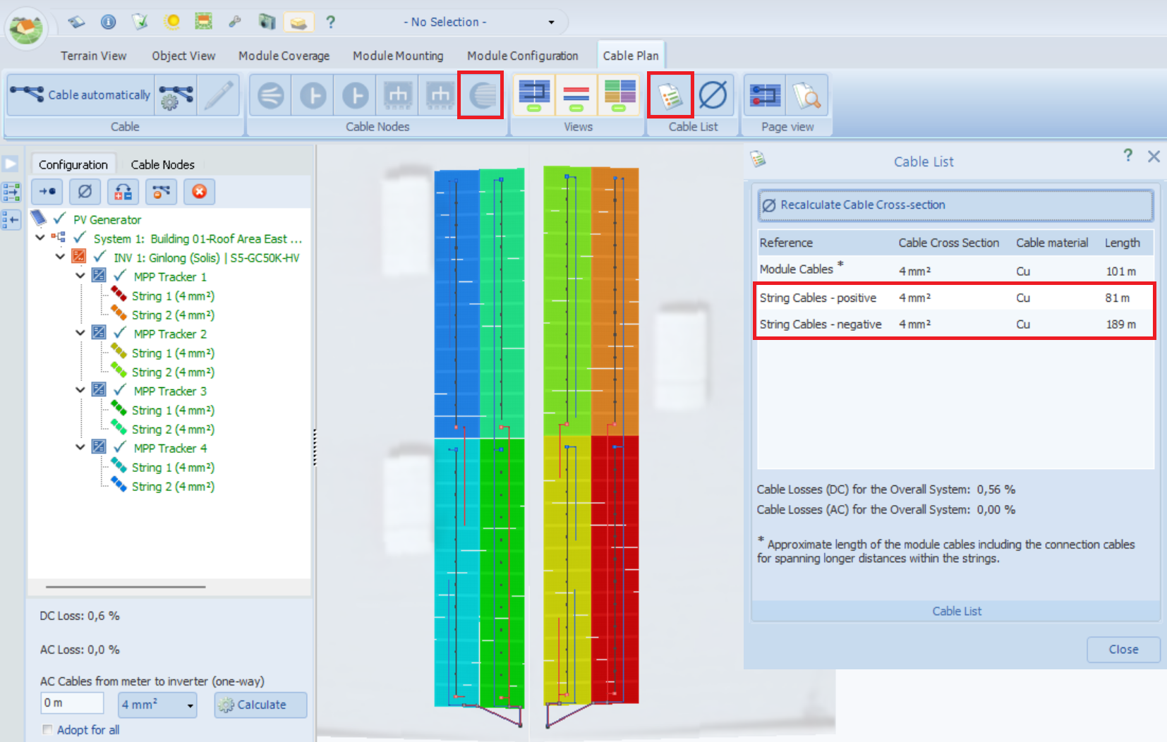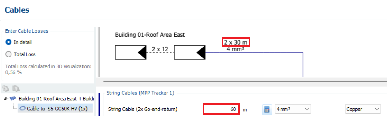 hotline_oh Posted February 26 Report Posted February 26 Dear Anders, Thank you for your inquiry. To connect both roof surfaces to the same inverter, click "Configure all unconfigured modules", select the two module areas using the Shift key and click "Configure module areas together": On the "Cables" page, enter twice the DC cable length for each MPP tracker, e.g., 60 m (if the outbound and return paths are each 30 m). The circuit diagram will then display the double DC cable length in the form "2 x 30 m": In the attached project, you may want to work with different lengths of positive and negative cables. To do this, use the "Cable Plan" page within the 3D environment. For example, if the inverter is located at the southern end of the building, add two cable grommets there, connect four strings to each grommet, and let the software calculate the exact DC cable lengths: Press the F1 key to access the help page for cable dimensioning. The project file we have processed is attached. Dagrofa Randers VAL.pvprj Quote