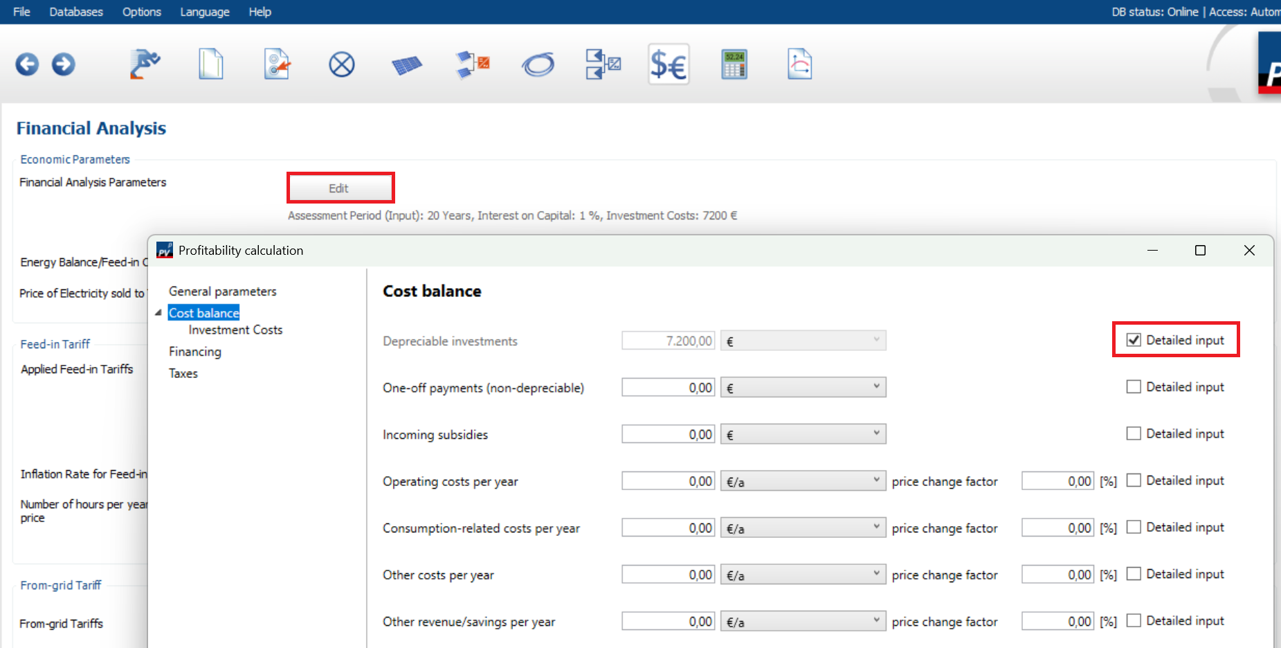 hotline_oh Posted 16 hours ago Report Posted 16 hours ago Hi Dave, Thank you for your inquiry. Our PV software cannot calculate costs. Component prices and other costs are not included. You must determine the costs of your planned system yourself. The calculated system price is entered into the profitability analysis and thus forms the basis for the financial forecast. The forms in the "financial analysis" module are pre-populated with sample values and do not represent average or empirical values. You must adjust these to suit your specific project. You can enter the detailed investment costs here: Quote