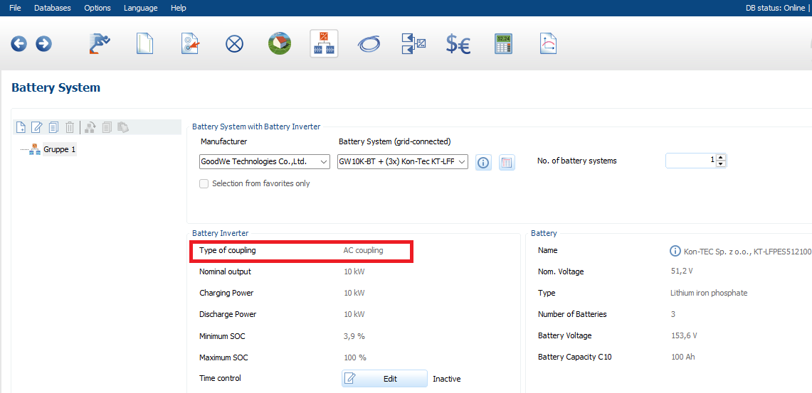 hotline_oh Posted 34 minutes ago Report Posted 34 minutes ago Dear Mark, Thank you for your inquiry. In PV*SOL, we distinguish between DC-coupled and AC-coupled battery systems. We assume you intend to use a hybrid inverter with an AC-coupled battery system. You must select the hybrid inverter twice in the program: once when configuring the modules (as the PV inverter) and again when selecting the battery system. When selecting the battery system, please ensure you choose a battery system with AC coupling. Quote